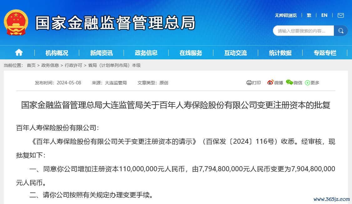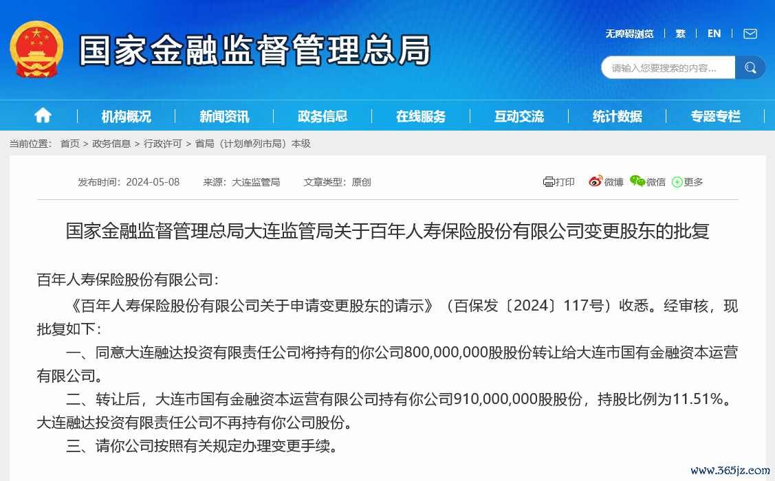 5月8日下午,国家金融监管总局官网披露,同意百年人寿增加注册资本至79亿元,同意大连市国有金融资本运营有限公司受让部分股权。